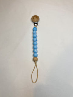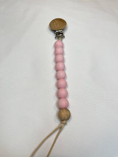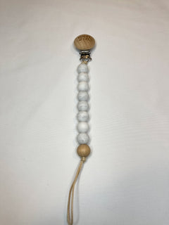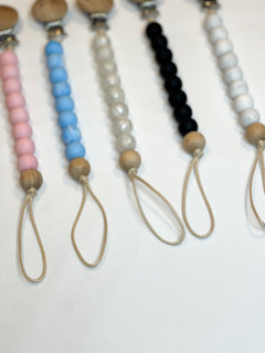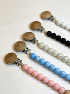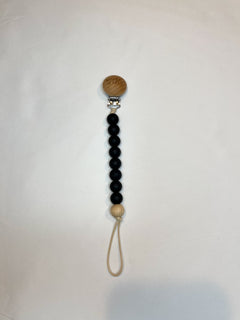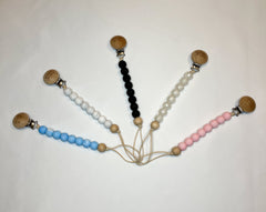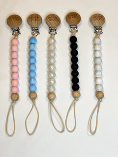 The RHETT & CO. silicone pacifier clip offers durability, function and simplicity to families on-the-go. Made from 100% food-grade silicone, our clip features a faux wood clasp that brings a modern take to a traditional favorite. With a simple stack of silicone beads, the clip offers a sophisticated touch to your pacifier accessories. The clip is easy to clean and helps keep soothing items in reach for little ones.
